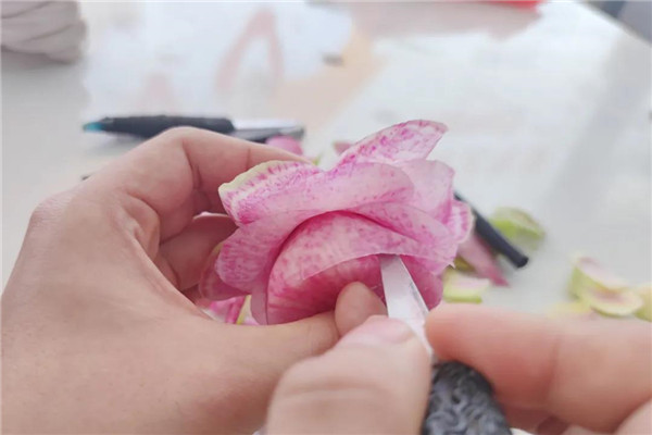 宁英迪在老师一对一的耐心指导下,每天早早来到学校提前到教室自己默默练习雕刻,等待上课的到来。宁英迪努力认真的付出,加上之前在华南烹饪学习过累计下来的烹饪基础,在短短几日内食品雕刻技能便得到了很大的提升,雕刻的各式花朵栩栩如生,惟妙惟肖,得到了老师对其天赋高、认真好学的好评。